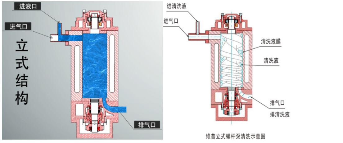我公司生產(chǎn)的立式真空泵,清洗液從進(jìn)氣口吸入,在螺桿旋轉(zhuǎn)帶動下,全方位清洗,不留死角。立式真空泵清洗結(jié)束,清洗液從排氣口全部流出,既可實(shí)現(xiàn)真正意義上的全方位清洗,又可解決臥式泵留有殘液的問題。
